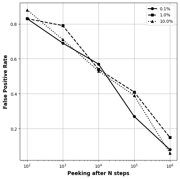 - Repeat for different peek intervals $N$, from very frequent peeking to less frequent.